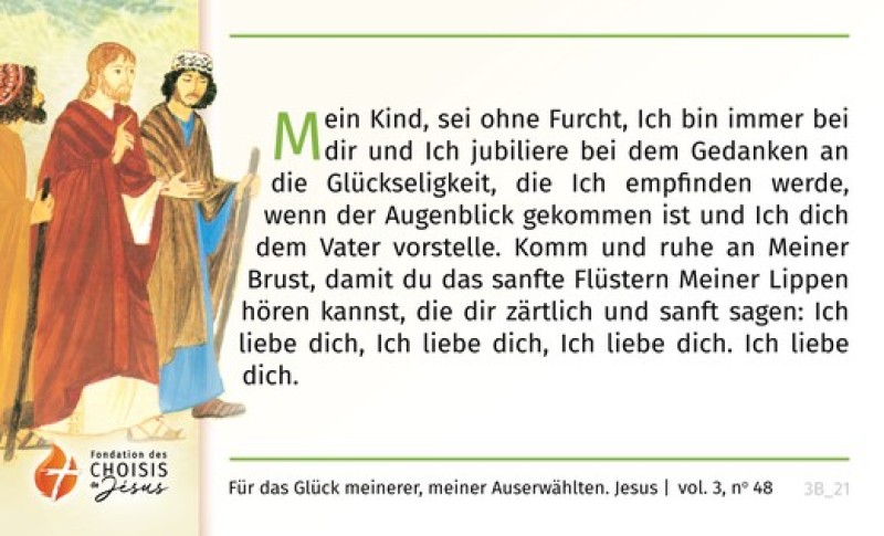 Mein Kind, sei ohne Furcht, Ich bin immer bei dir und Ich jubiliere bei dem Gedanken an die Glückseligkeit, die Ich empfinden werde, wenn der Augenblick gekommen ist und Ich dich dem Vater vorstelle. Komm und ruhe an Meiner Brust, damit du das sanfte Flüstern Meiner Lippen hören kannst, die dir zärtlich und sanft sagen: Ich liebe dich, Ich liebe dich, Ich liebe dich. Ich liebe dich.