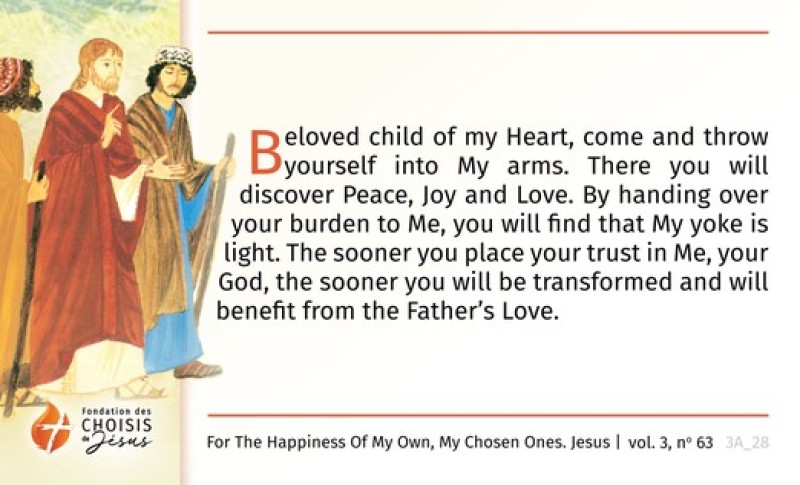 Beloved child of my Heart, come and throw yourself into My arms. There you will discover Peace, Joy and Love. By handing over your burden to Me, you will find that My yoke is light. The sooner you place your trust in Me, your God, the sooner you will be transformed and will benefit from the Father’s Love.