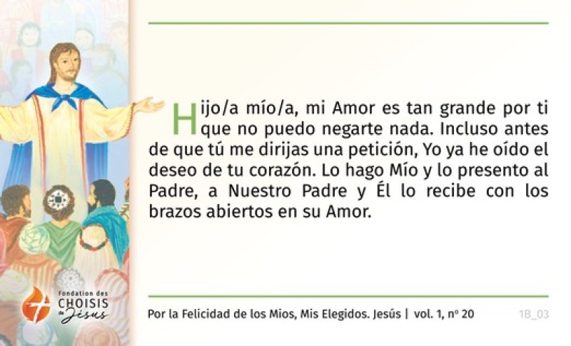 Hijo/a mío/a, mi Amor es tan grande por ti que no puedo negarte nada. Incluso antes de que tú me dirijas una petición, Yo ya he oído el deseo de tu corazón. Lo hago Mío y lo presento al Padre, a Nuestro Padre y Él lo recibe con los brazos abiertos en su Amor.