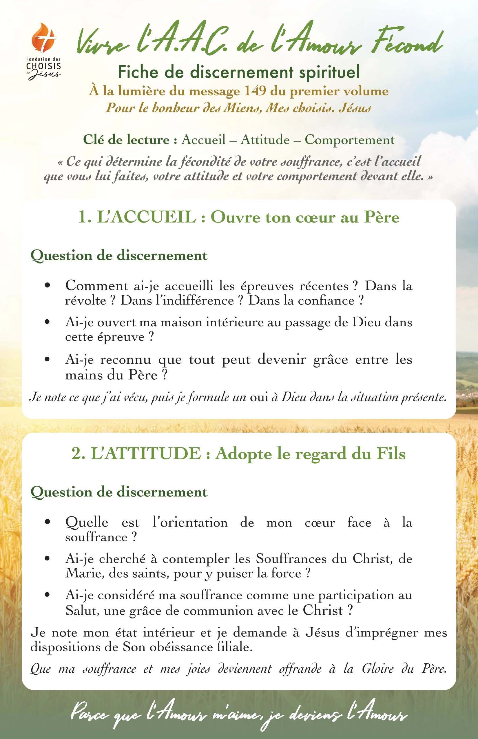 Découvre aussi une fiche de discernement spirituel, préparée pour t'aider à cheminer dans cette démarche de vivre l'A.V.A. de l'Amour rédempteur.