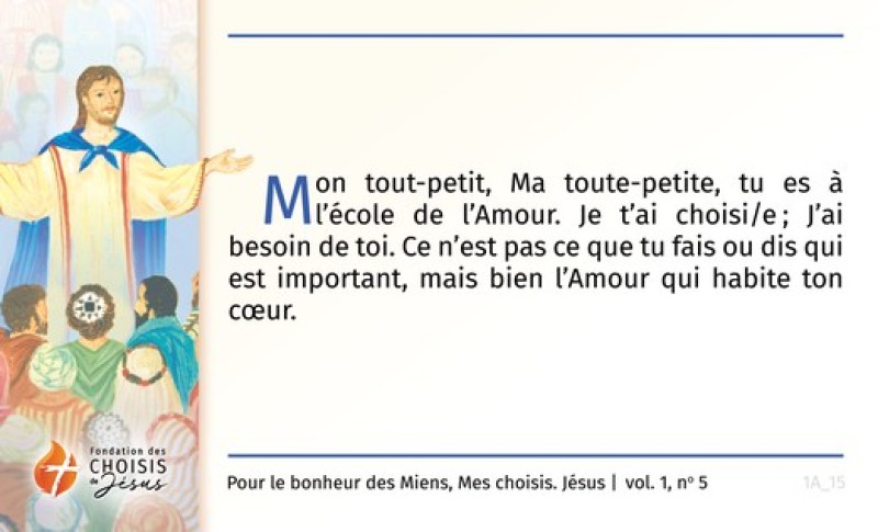 Mon tout-petit, Ma toute-petite, tu es à l'école de l'Amour. Je t'ai choisi/e; J'ai besoin de toi. Ce n'est pas ce que tu fais ou dis qui est important, mais bien l'Amour qui habite ton coeur.