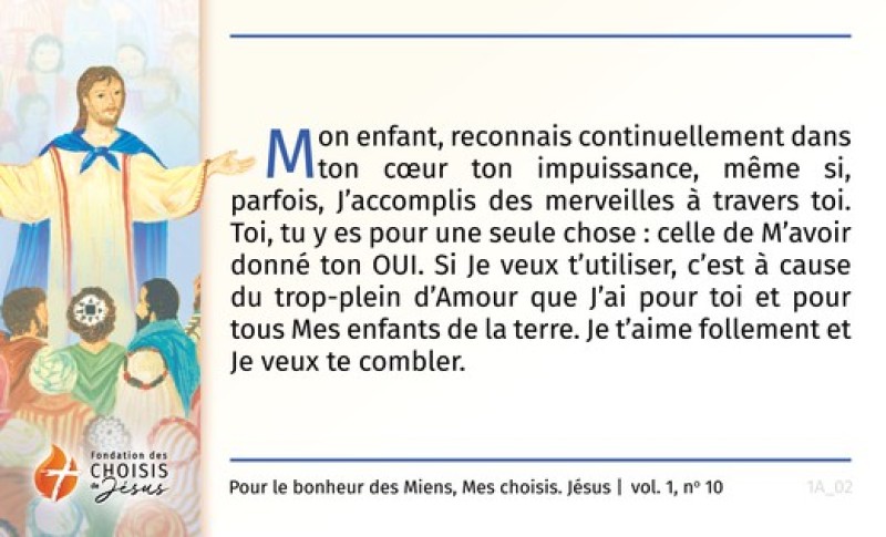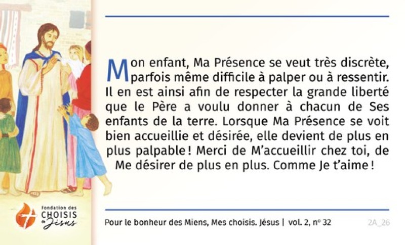 Mon enfant, Ma Présence se veut très discrète, parfois même difficile à palper ou à ressentir. Il en est ainsi afin de respecter la grande liberté que le Père a voulu donner à chacun de Ses enfants de la terre. Lorsque Ma Présence se voit bien accueillie et désirée, elle devient de plus en plus palpable! Merci de M'accueillir chez toi, de Me désirer de plus en plus. Comme Je t'aime!