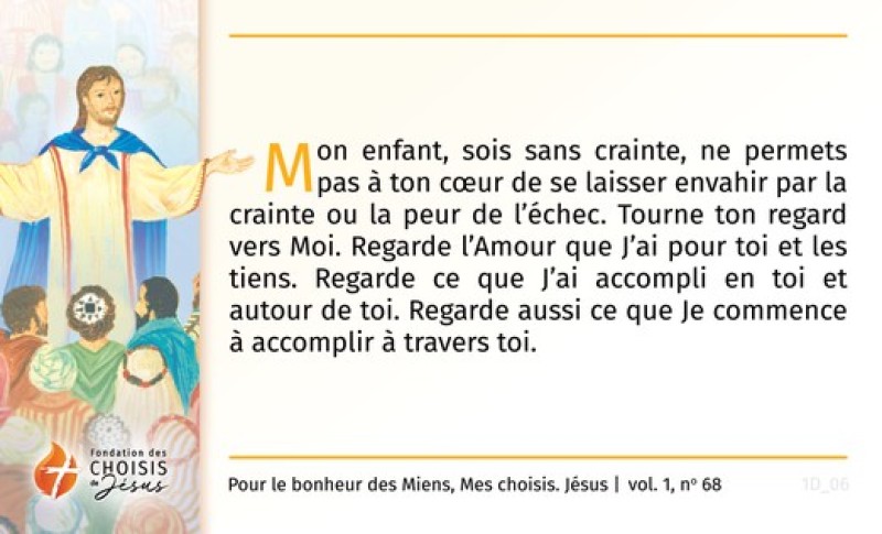 Mon enfant, sois sans crainte, ne permets pas à ton coeur de se laisser envahir par la crainte ou la peur de l'échec. Tourne ton regard vers Moi. Regarde l'Amour que J'ai pour toi et les tiens. Regarde ce que J'ai accompli en toi et autour de toi. Regarde aussi ce que Je commence à accomplir à travers toi.