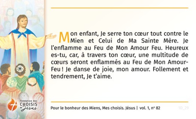 Mon enfant, Je serre ton coeur tout contre le Mien et Celui de Ma Sainte Mère. Je l'enflamme au Feu de Mon Amour Feu. Heureux es-tu car, à travers ton coeur, une multitude de coeurs seront enflammés au Feu de Mon Amour Feu. Je danse de joie, mon amour. Follement et tendrement, Je t'aime.