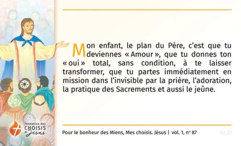 Mon enfant, le plan du Père, c'est que tu deviennes 'Amour', que tu donnes ton «oui» total, sans condition, à te laisser transformer, que tu partes immédiatement en mission dans l'invisible par la prière, l'adoration, la pratique des Sacrements et aussi le jeûne.