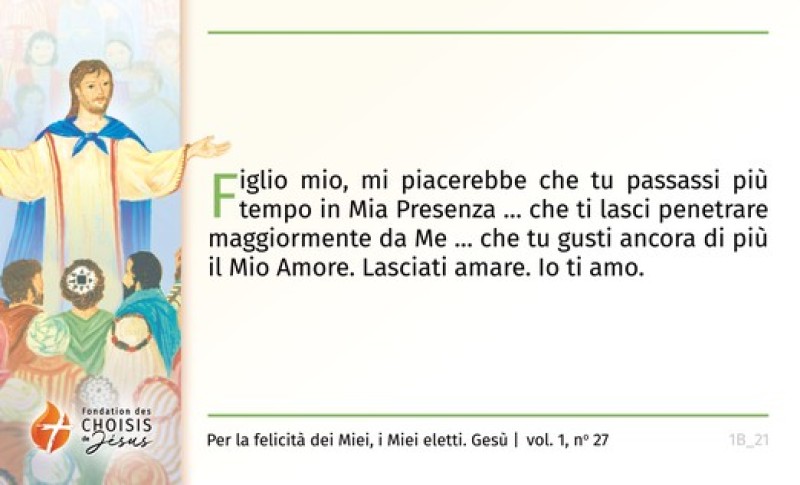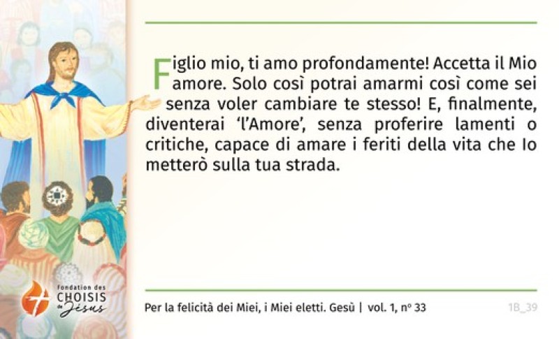 Figlio mio, ti amo profondamente! Accetta il Mio amore. Solo così potrai amarmi così come sei senza voler cambiare te stesso! E, finalmente, diventerai ‘l’Amore’, senza proferire lamenti o critiche, capace di amare i feriti della vita che Io metterò sulla tua strada.
