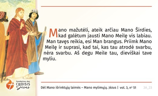 Mano mažutėli, ateik arčiau Mano Širdies, kad galėtum jausti Mano Meilę vis labiau. Man tavęs reikia, esi Man brangus. Priimk Mano Meilę ir suprasi, kad tai, kas tau atrodė svarbu, nėra svarbu. Aš degu Meile tau, dieviškai tave myliu.