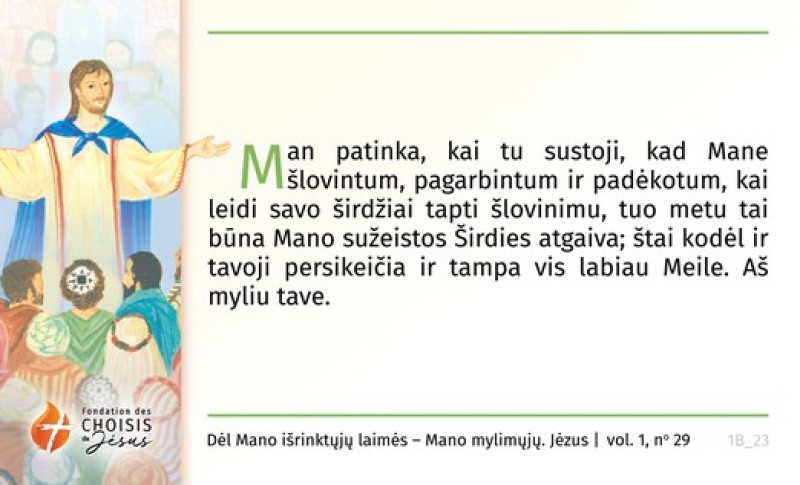 Man patinka, kai tu sustoji, kad Mane šlovintum, pagarbintum ir padėkotum, kai leidi savo širdžiai tapti šlovinimu, tuo metu tai būna Mano sužeistos Širdies atgaiva; štai kodėl ir tavoji persikeičia ir tampa vis labiau Meile. Aš myliu tave.