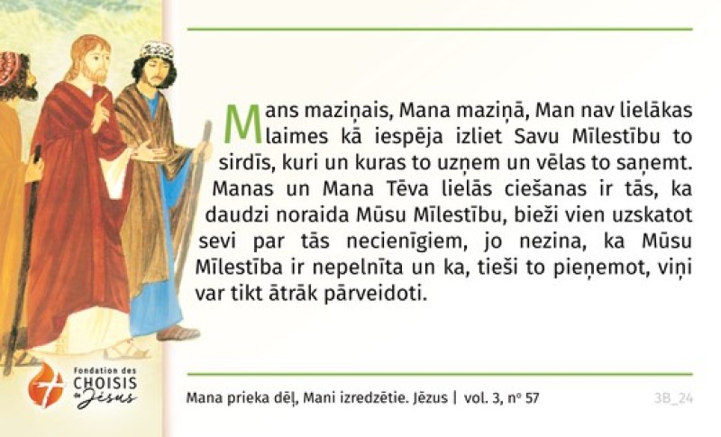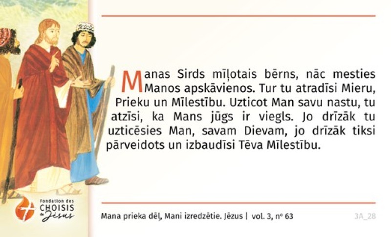 Manas Sirds mīļotais bērns, nāc mesties Manos apskāvienos. Tur tu atradīsi Mieru, Prieku un Mīlestību. Uzticot Man savu nastu, tu atzīsi, ka Mans jūgs ir viegls. Jo drīzāk tu uzticēsies Man, savam Dievam, jo drīzāk tiksi pārveidots un izbaudīsi Tēva Mīlestību.