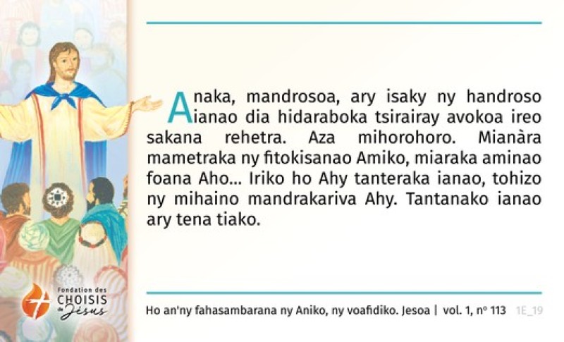 Anaka, mandrosoa, ary isaky ny handroso ianao dia hidaraboka tsirairay avokoa ireo sakana rehetra. Aza mihorohoro. Mianàra mametraka ny fitokisanao Amiko, miaraka aminao foana Aho… Iriko ho Ahy tanteraka ianao, tohizo ny mihaino mandrakariva Ahy. Tantanako ianao ary tena tiako.