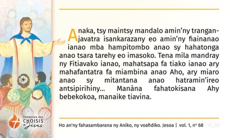 Anaka, tsy maintsy mandalo amin’ny trangan-javatra isankarazany eo amin’ny fiainanao ianao mba hampitombo anao sy hahatonga anao tsara tarehy eo imasoko. Tena mila mandray ny Fitiavako ianao, mahatsapa fa tiako ianao ary mahafantatra fa miambina anao Aho, ary miaro anao sy mitantana anao hatramin’ireo antsipirihiny… Manàna fahatokisana Ahy bebekokoa, manaike tiavina.