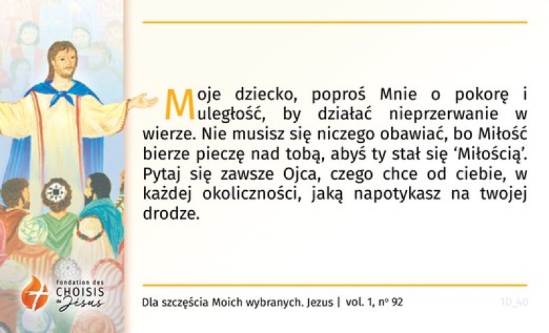 Moje dziecko, poproś Mnie o pokorę i uległość, by działać nieprzerwanie w wierze. Nie musisz się niczego obawiać, bo Miłość bierze pieczę nad tobą, abyś ty stał się ‘Miłością’. Pytaj się zawsze Ojca, czego chce od ciebie, w każdej okoliczności, jaką napotykasz na twojej drodze.