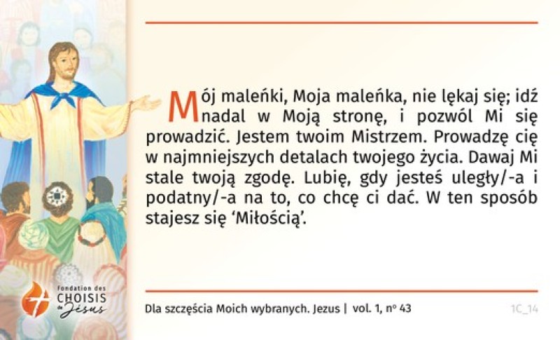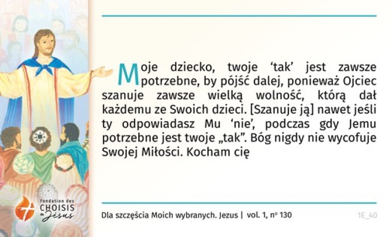 Moje dziecko, twoje ‘tak’ jest zawsze potrzebne, by pójść dalej, ponieważ Ojciec szanuje zawsze wielką wolność, którą dał każdemu ze Swoich dzieci. [Szanuje ją] nawet jeśli ty odpowiadasz Mu ‘nie’, podczas gdy Jemu potrzebne jest twoje „tak”. Bóg nigdy nie wycofuje Swojej Miłości. Kocham cię