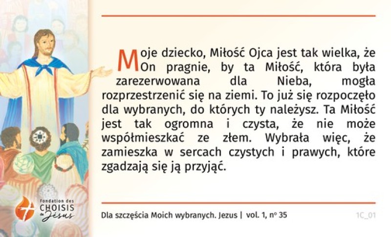 Moje dziecko, Miłość Ojca jest tak wielka, że On pragnie, by ta Miłość, która była zarezerwowana dla Nieba, mogła rozprzestrzenić się na ziemi. To już się rozpoczęło dla wybranych, do których ty należysz. Ta Miłość jest tak ogromna i czysta, że nie może współmieszkać ze złem. Wybrała więc, że zamieszka w sercach czystych i prawych, które zgadzają się ją przyjąć.