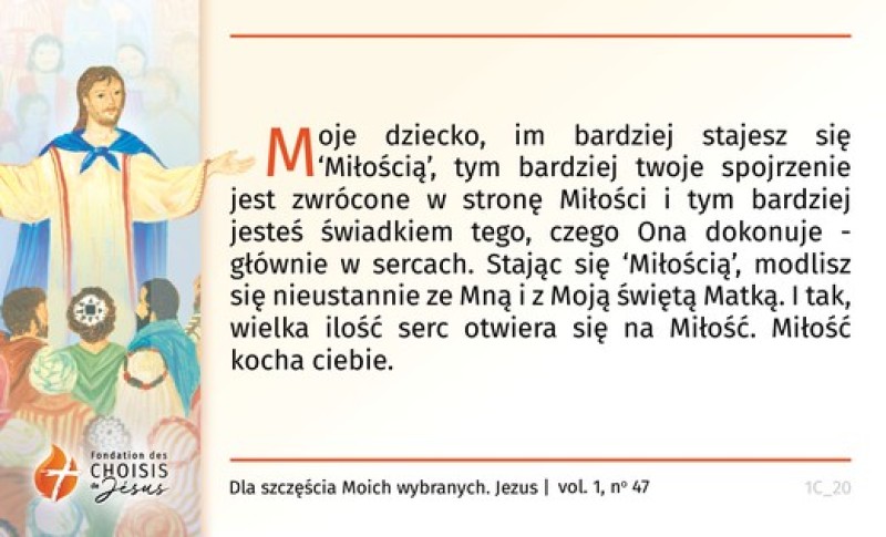 Moje dziecko, im bardziej stajesz się ‘Miłością’, tym bardziej twoje spojrzenie jest zwrócone w stronę Miłości i tym bardziej jesteś świadkiem tego, czego Ona dokonuje - głównie w sercach. Stając się ‘Miłością’, modlisz się nieustannie ze Mną i z Moją świętą Matką. I tak, wielka ilość serc otwiera się na Miłość. Miłość kocha ciebie.
