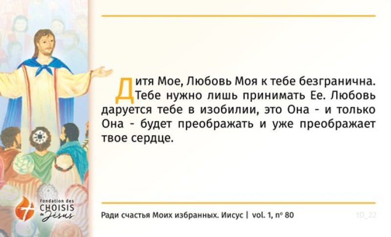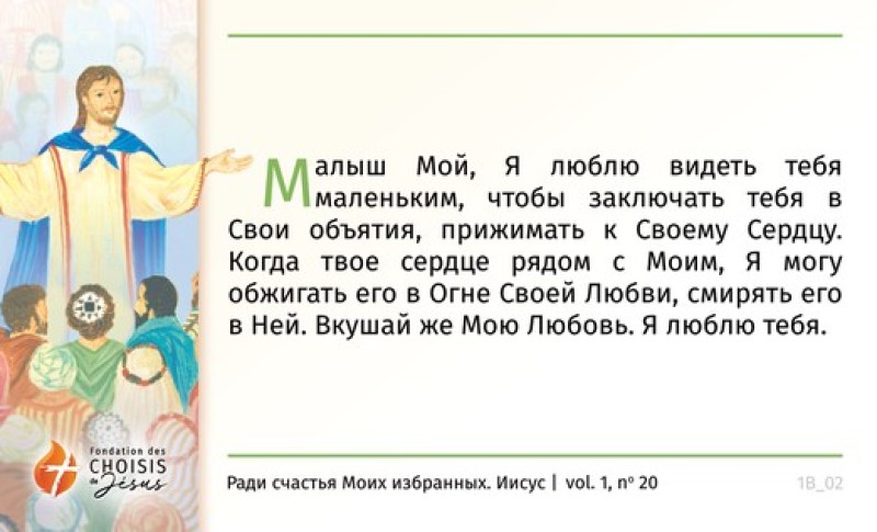 Малыш Мой, Я люблю видеть тебя маленьким, чтобы заключать тебя в Свои объятия, прижимать к Своему Сердцу. Когда твое сердце рядом с Моим, Я могу обжигать его в Огне Своей Любви, смирять его в Ней. Вкушай же Мою Любовь. Я люблю тебя.