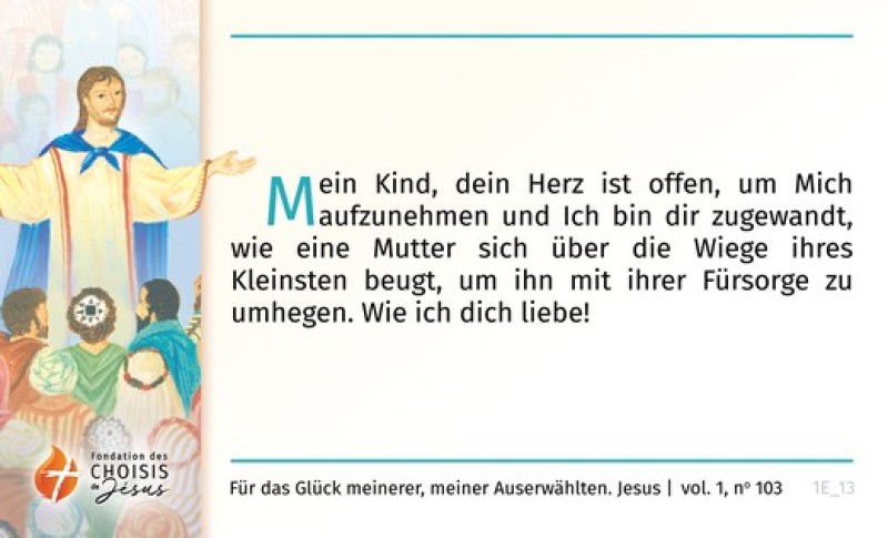 Mein Kind, dein Herz ist offen, um Mich aufzunehmen und Ich bin dir zugewandt, wie eine Mutter sich über die Wiege ihres Kleinsten beugt, um ihn mit ihrer Fürsorge zu umhegen. Wie ich dich liebe!