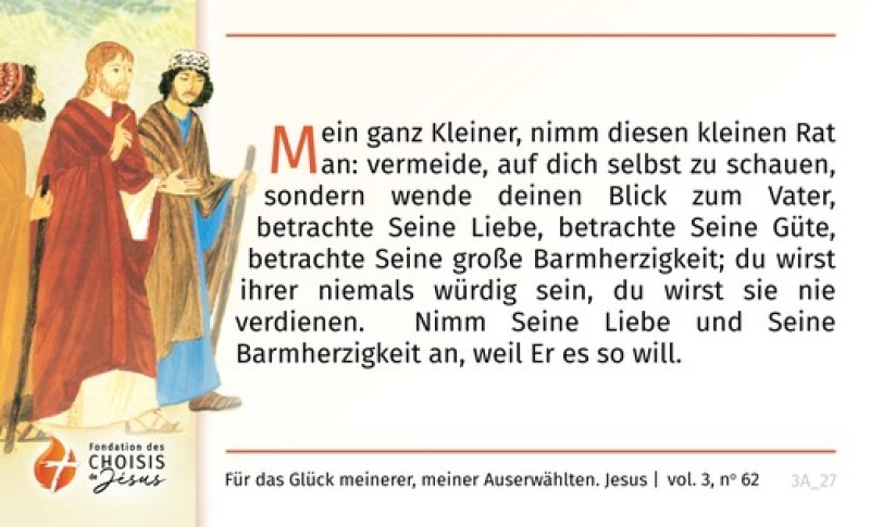 Mein ganz Kleiner, nimm diesen kleinen Rat an: vermeide, auf dich selbst zu schauen, sondern wende deinen Blick zum Vater, betrachte Seine Liebe, betrachte Seine Güte, betrachte Seine große Barmherzigkeit; du wirst ihrer niemals würdig sein, du wirst sie nie verdienen. Nimm Seine Liebe und Seine Barmherzigkeit an, weil Er es so will.