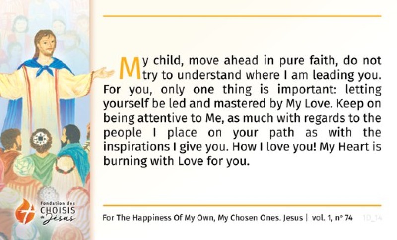 My child, move ahead in pure faith, do not try to understand where I am leading you. For you, only one thing is important: letting yourself be led and mastered by My Love. Keep on being attentive to Me, as much with regards to the people I place on your path as with the inspirations I give you. How I love you! My Heart is burning with Love for you.