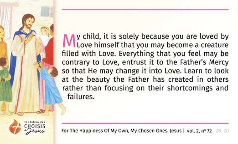 My child, it is solely because you are loved by Love himself that you may become a creature filled with Love. Everything that you feel may be contrary to Love, entrust it to the Father’s Mercy so that He may change it into Love. Learn to look at the beauty the Father has created in others rather than focusing on their shortcomings and failures.