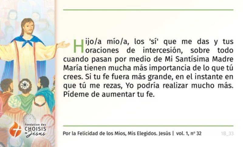 Hijo/a mío/a, los 'sí' que me das y tus oraciones de intercesión, sobre todo cuando pasan por medio de Mi Santísima Madre María tienen mucha más importancia de lo que tú crees. Si tu fe fuera más grande, en el instante en que tú me rezas, Yo podría realizar mucho más. Pídeme de aumentar tu fe.