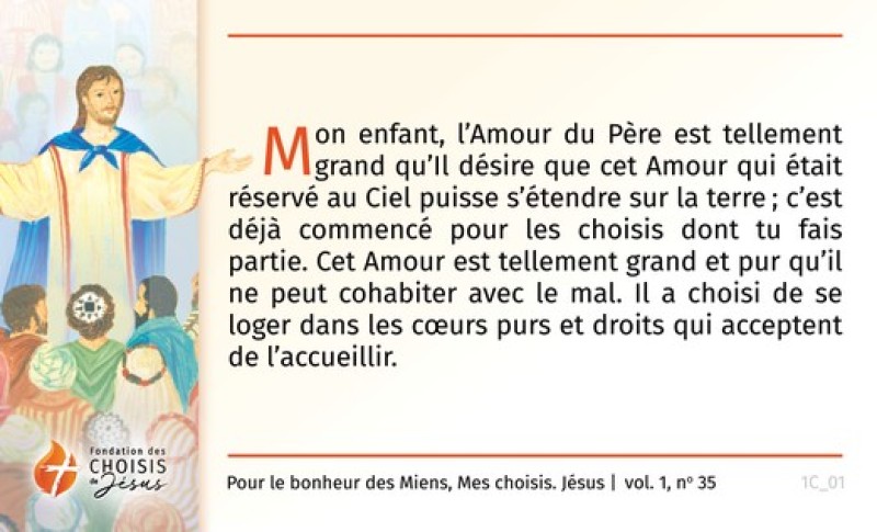 Mon enfant, l'Amour du Père est tellement grand qu'Il désire que cet Amour qui était réservé au Ciel puisse s'étendre sur la terre; c'est déjà commencé pour les choisis dont tu es. Cet Amour est tellement grand et pur qu'il ne peut cohabiter avec le mal. Il a choisi de se loger dans les coeurs purs et droits qui acceptent de l'accueillir.