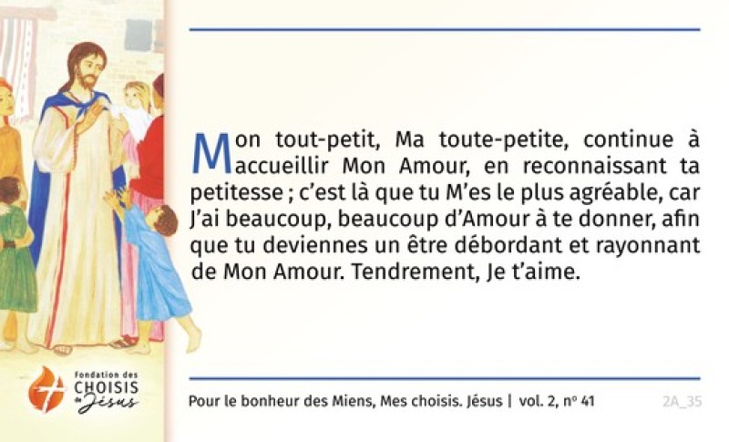 Mon tout-petit, Ma toute-petite, continue à accueillir Mon Amour, en reconnaissant ta petitesse; c'est là que tu M'es le plus agréable, car J'ai beaucoup, beaucoup d'Amour à te donner, afin que tu deviennes un être débordant et rayonnant de Mon Amour. Tendrement, Je t'aime.