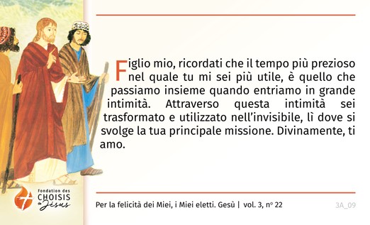 Figlio mio, ricordati che il tempo più prezioso nel quale tu mi sei più utile, è quello che passiamo insieme quando entriamo in grande intimità. Attraverso questa intimità sei trasformato e utilizzato nell’invisibile, lì dove si svolge la tua principale missione. Divinamente, ti amo.