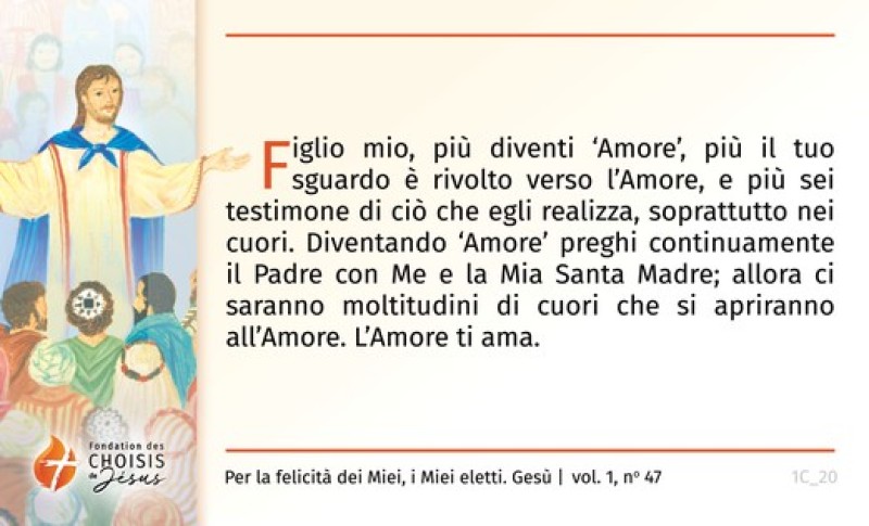 Figlio mio, più diventi ‘Amore’, più il tuo sguardo è rivolto verso l’Amore, e più sei testimone di ciò che egli realizza, soprattutto nei cuori. Diventando ‘Amore’ preghi continuamente il Padre con Me e la Mia Santa Madre; allora ci saranno moltitudini di cuori che si apriranno all’Amore. L’Amore ti ama.