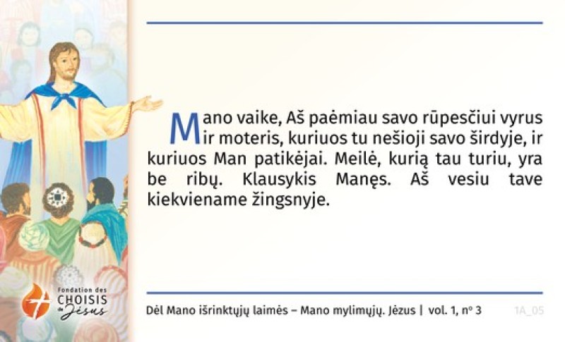 Mano vaike, Aš paėmiau savo rūpesčiui vyrus ir moteris, kuriuos tu nešioji savo širdyje, ir kuriuos Man patikėjai. Meilė, kurią tau turiu, yra be ribų. Klausykis Manęs. Aš vesiu tave kiekviename žingsnyje.