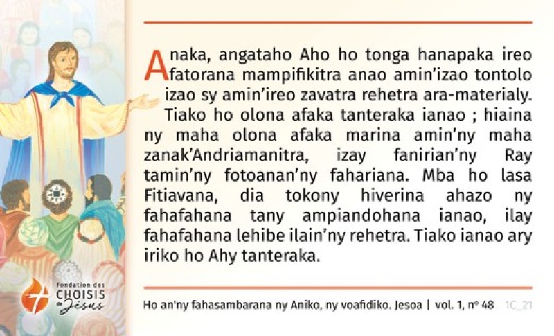 Anaka, angataho Aho ho tonga hanapaka ireo fatorana mampifikitra anao amin’izao tontolo izao sy amin’ireo zavatra rehetra ara-materialy. Tiako ho olona afaka tanteraka ianao ; hiaina ny maha olona afaka marina amin’ny maha zanak’Andriamanitra, izay fanirian’ny Ray tamin’ny fotoanan’ny fahariana. Mba ho lasa Fitiavana, dia tokony hiverina ahazo ny fahafahana tany ampiandohana ianao, ilay fahafahana lehibe ilain’ny rehetra. Tiako ianao ary iriko ho Ahy tanteraka.