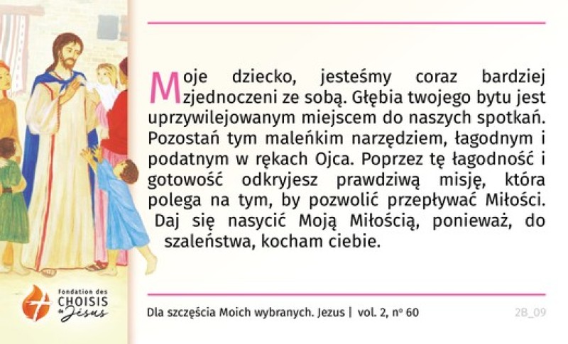 Moje dziecko, jesteśmy coraz bardziej zjednoczeni ze sobą. Głębia twojego bytu jest uprzywilejowanym miejscem do naszych spotkań. Pozostań tym maleńkim narzędziem, łagodnym i podatnym w rękach Ojca. Poprzez tę łagodność i gotowość odkryjesz prawdziwą misję, która polega na tym, by pozwolić przepływać Miłości. Daj się nasycić Moją Miłością, ponieważ, do szaleństwa, kocham ciebie.